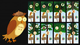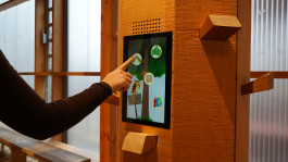 Die Baumstation sollte noch interaktiver genutzt werden können, weswegen eine Touchinteraktion hinzugefügt wurde. Nach Einschieben des Holzkeils erscheint auf dem Bildschirm ein kurzer Aufmacher mit interessanten Fakten oder Informationen zur jeweiligen Baumart. Anschließend erscheint dazu ein Menü, in dem sich die Waldpavillon Besucher*innen durch die unterschiedlichen Kategorien „Aufmacher“, „Frucht“, „Blatt“, „Rinde“ und „Klima“ durchtippen können. Die animierten Clips sind dabei kinderfreundlich und einfach gehalten. Erklärt werden die Informationen von einer klugen Eule.