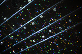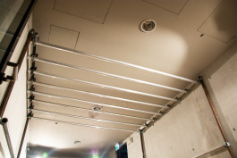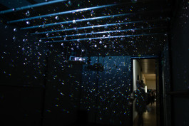 Die Installation ist so konzipiert, dass der Besucher unter der Installation hindurchgehen kann. Somit wurden die Stangen, Kristalle und Beamer über der durchschnittlichen Körpergröße der Studierenden angebracht.